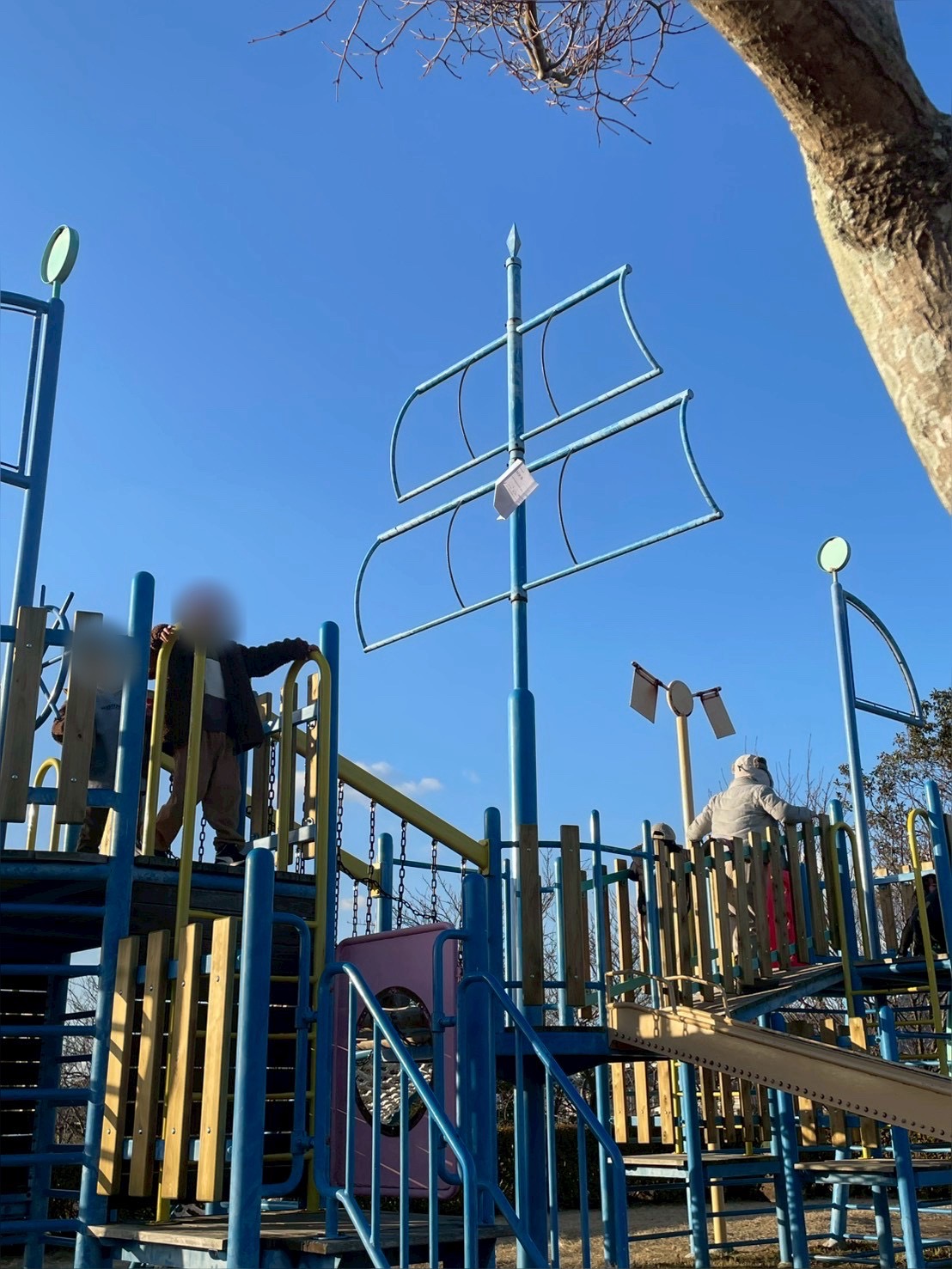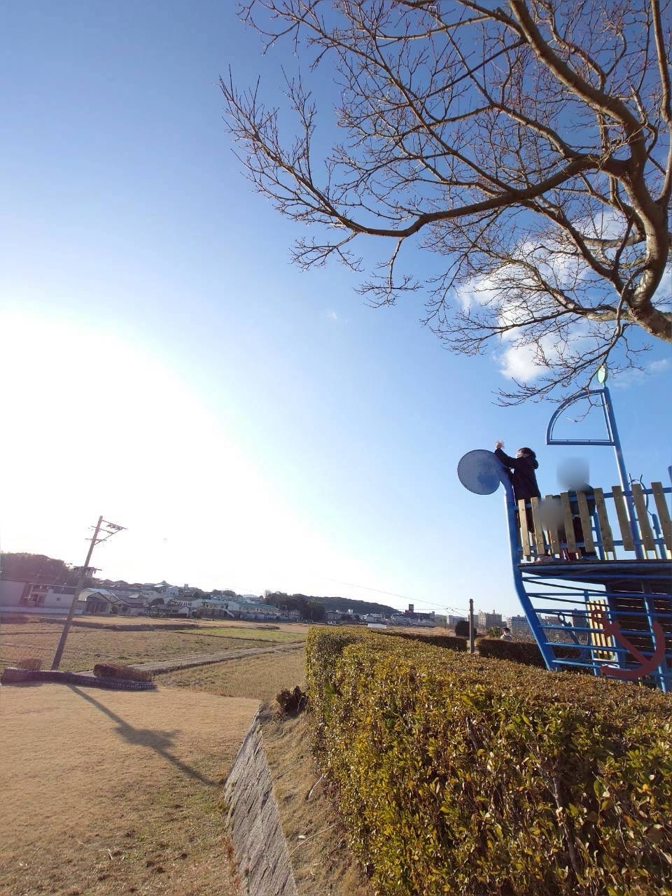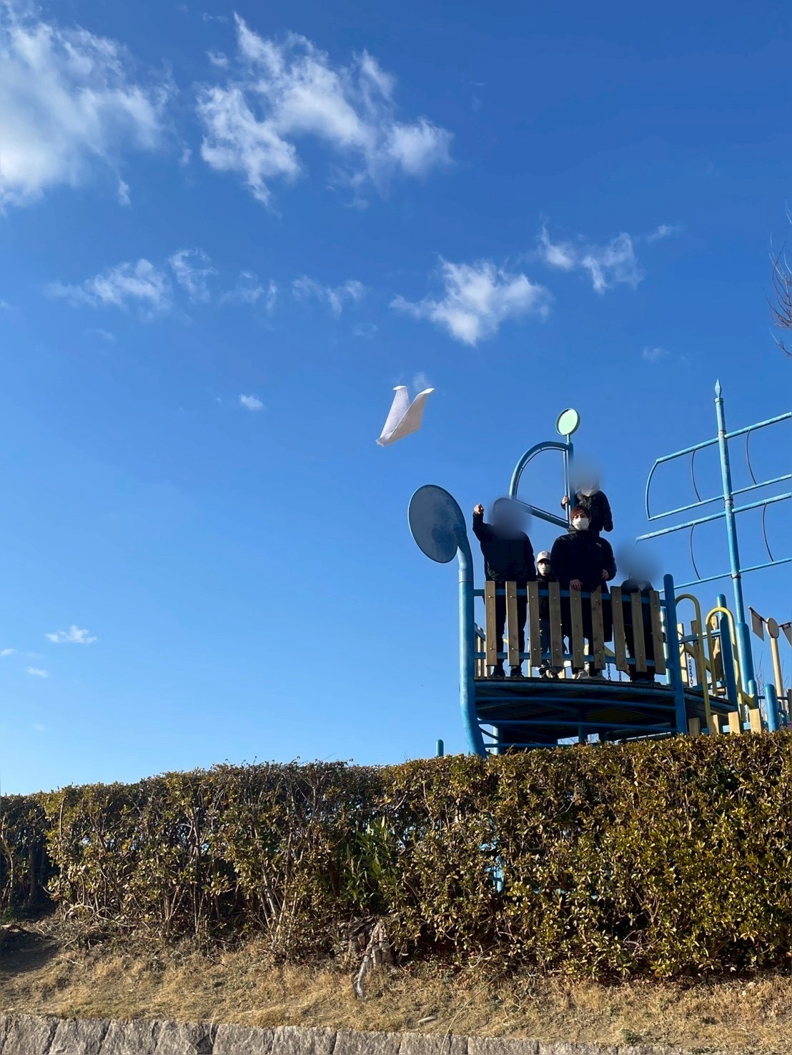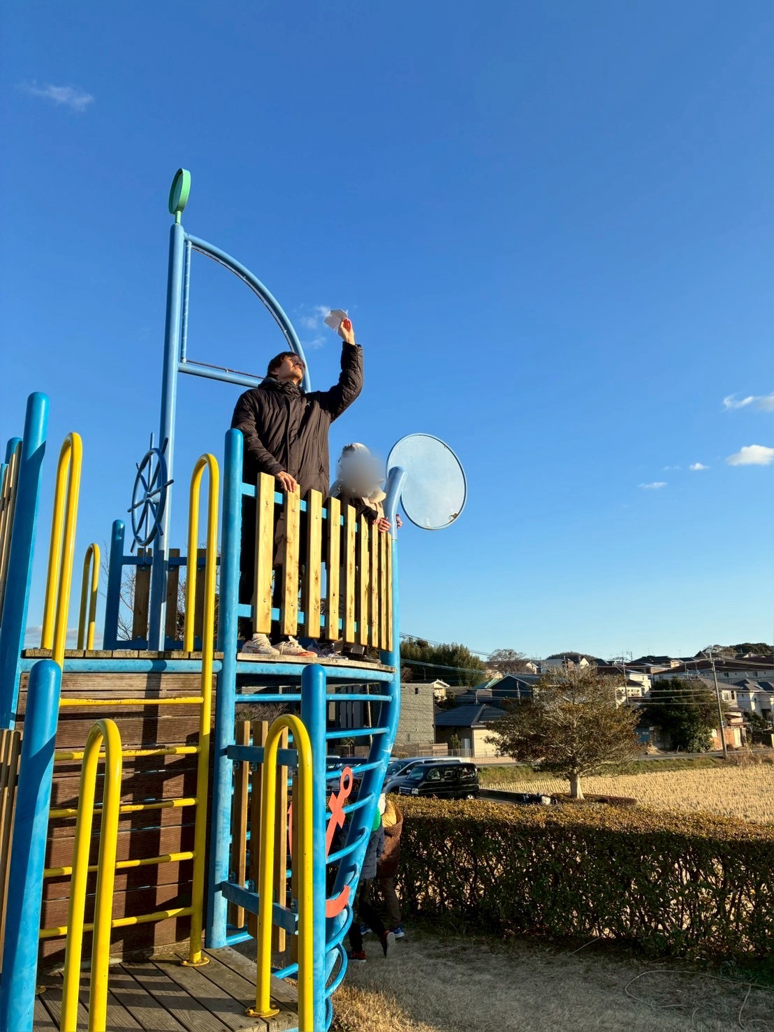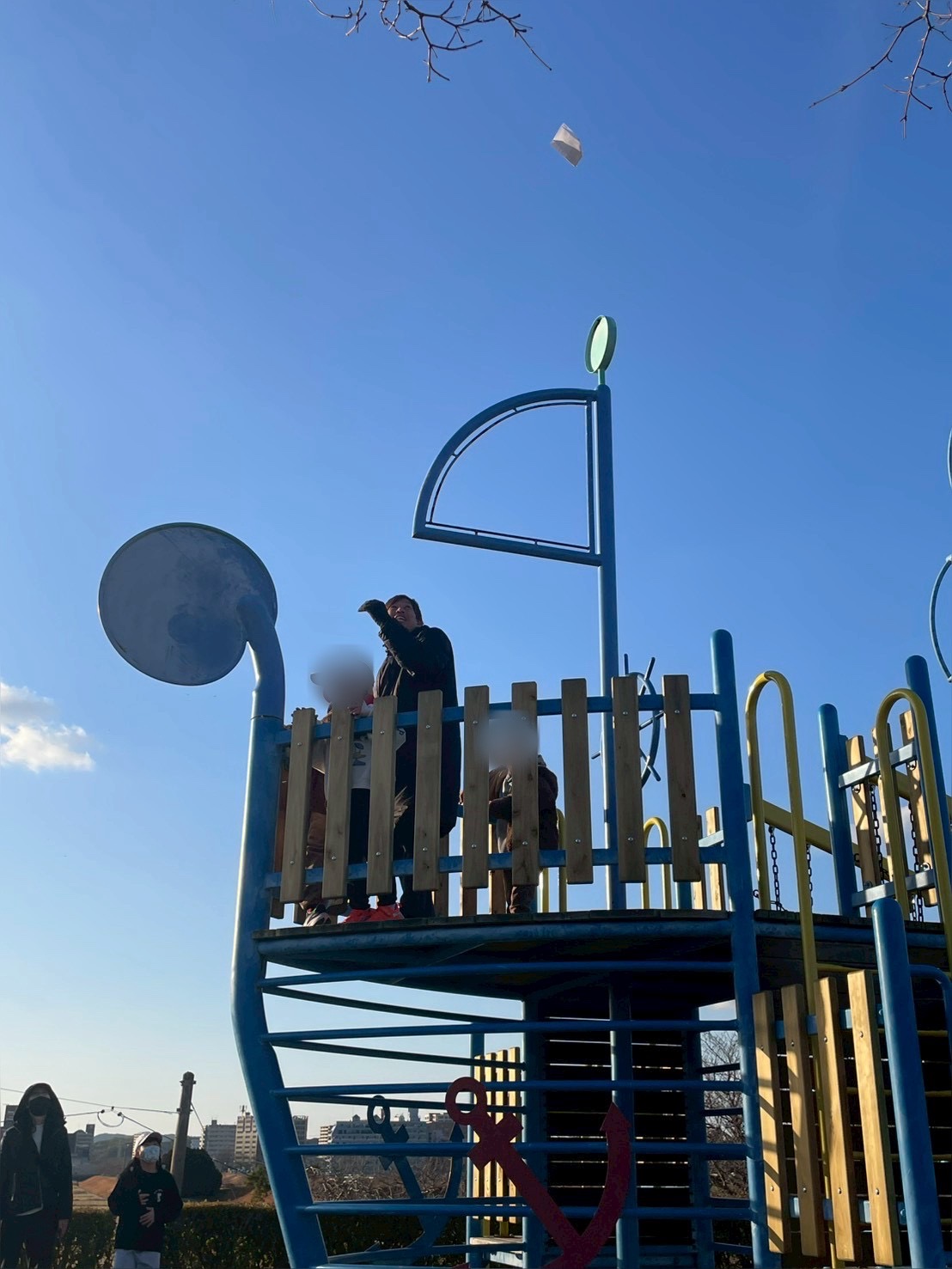 とにかくさくら公園にある大きな船の遊具の上から紙飛行機を飛ばしたいノブ先生✈️